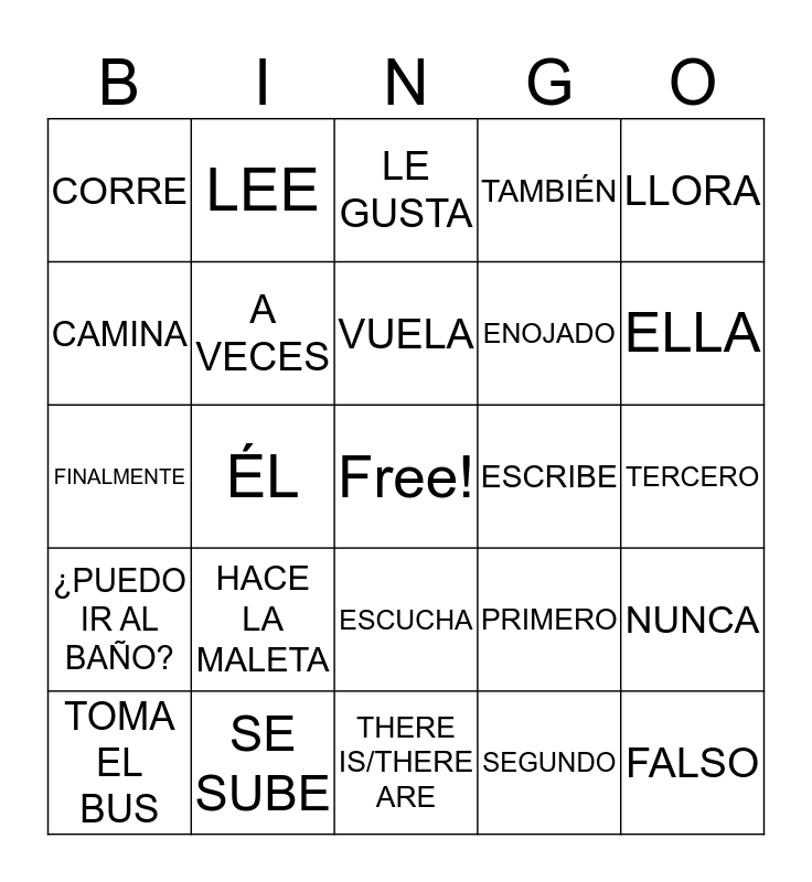 This bingo card has a free space and 24 words: HACE LA MALETA, SE SUBE, VUELA, TOMA EL BUS, LLORA, CORRE, CAMINA, LEE, ESCRIBE, ESCUCHA, ENOJADO, FINALMENTE, PRIMERO, NUNCA, A VECES, SEGUNDO, TERCERO, LE GUSTA, ELLA, ÉL, FALSO, ¿PUEDO IR AL BAÑO?, TAMBIÉN and THERE IS/THERE ARE.