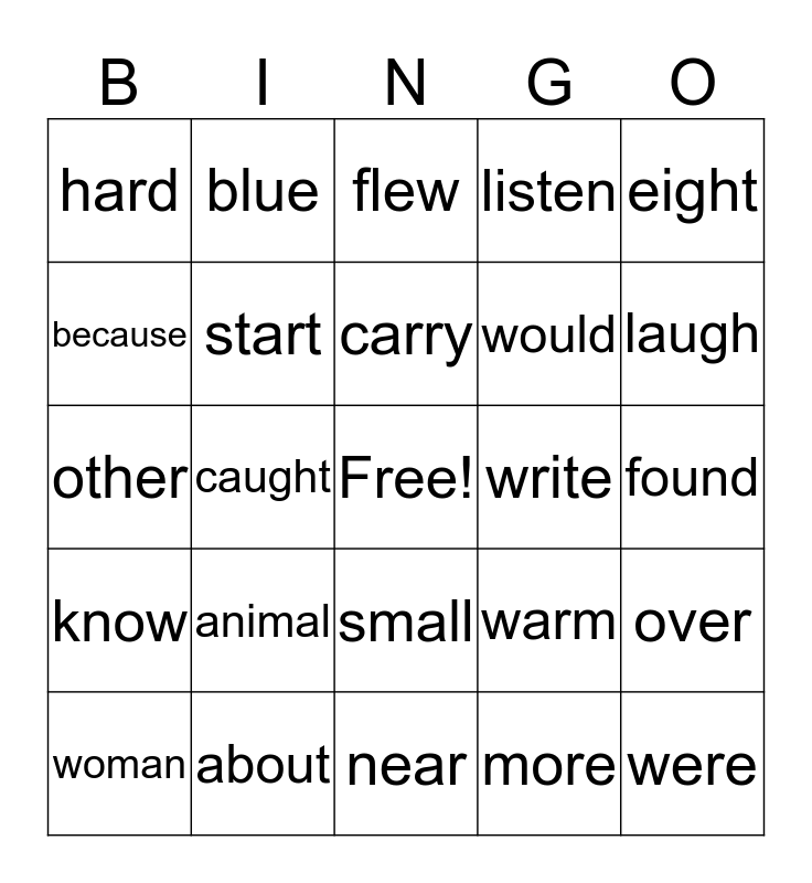 This bingo card has a free space and 24 words: animal, about, carry, woman, eight, hard, because, blue, write, small, would, other, warm, over, start, more, found, flew, laugh, caught, were, know, listen and near.
