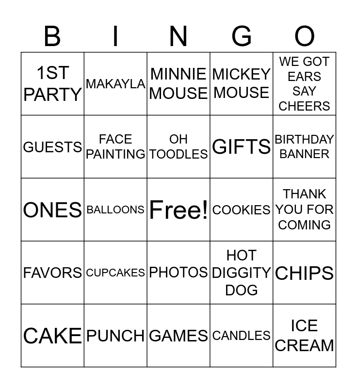 This bingo card has a free space and 24 words: CUPCAKES, PUNCH, OH TOODLES, CAKE, WE GOT EARS SAY CHEERS, 1ST PARTY, GUESTS, MAKAYLA, COOKIES, PHOTOS, GIFTS, ONES, HOT DIGGITY DOG, CHIPS, FACE PAINTING, CANDLES, THANK YOU FOR COMING, MINNIE MOUSE, BIRTHDAY BANNER, BALLOONS, ICE CREAM, FAVORS, MICKEY MOUSE and GAMES.