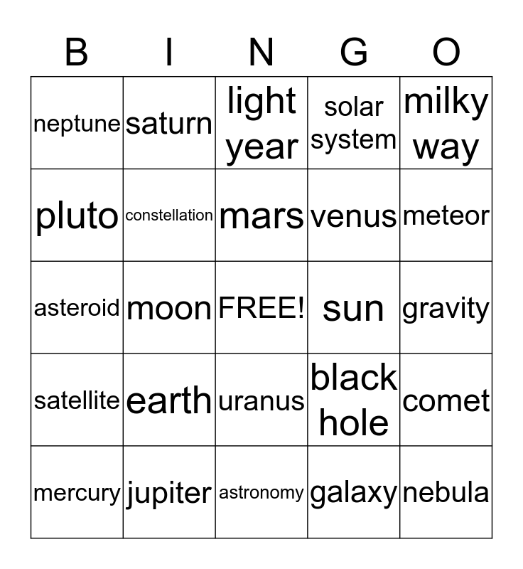 This bingo card has a free space and 24 words: earth, jupiter, mars, mercury, milky way, neptune, pluto, saturn, sun, uranus, venus, asteroid, black hole, comet, constellation, galaxy, gravity, light year, meteor, moon, nebula, satellite, solar system and astronomy.