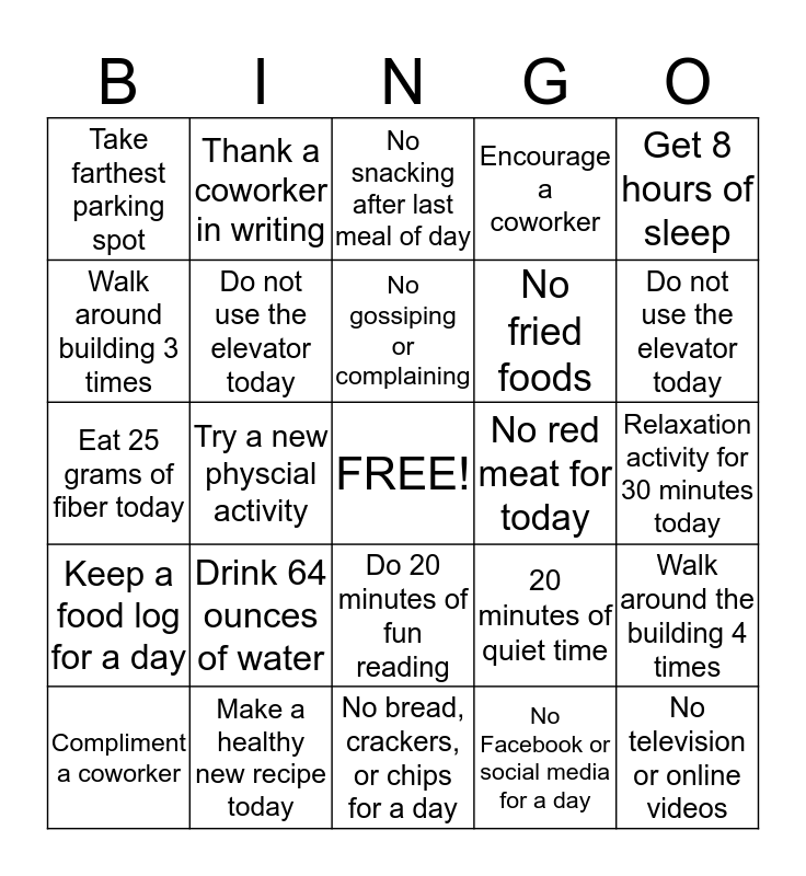 This bingo card has a free space and 24 words: Drink 64 ounces of water, Make a healthy new recipe today, No gossiping or complaining, Compliment a coworker, Get 8 hours of sleep, Take farthest parking spot, Walk around building 3 times, Thank a coworker in writing, No red meat for today, Do 20 minutes of fun reading, No fried foods, Eat 25 grams of fiber today, 20 minutes of quiet time, Walk around the building 4 times, Do not use the elevator today, No Facebook or social media for a day, Relaxation activity for 30 minutes today, No snacking after last meal of day, Do not use the elevator today, Try a new physcial activity, No television or online videos, Keep a food log for a day, Encourage a coworker and No bread, crackers, or chips for a day.