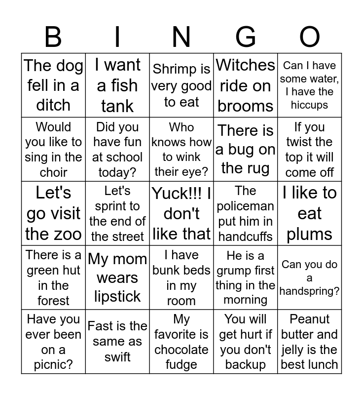 This bingo card has 25 words: My mom wears lipstick, My favorite is chocolate fudge, Who knows how to wink their eye?, Have you ever been on a picnic?, Can I have some water, I have the hiccups, The dog fell in a ditch, Would you like to sing in the choir, I want a fish tank, The policeman put him in handcuffs, I have bunk beds in my room, There is a bug on the rug, Let's go visit the zoo, He is a grump first thing in the morning, Can you do a handspring?, Did you have fun at school today?, Peanut butter and jelly is the best lunch, I like to eat plums, Shrimp is very good to eat, If you twist the top it will come off, Let's sprint to the end of the street, Yuck!!! I don't like that, Fast is the same as swift, There is a green hut in the forest, Witches ride on brooms and You will get hurt if you don't backup.