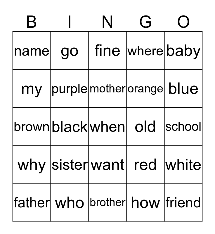 This bingo card has 25 words: sister, brother, mother, father, baby, name, my, go, old, want, orange, brown, red, white, purple, friend, school, fine, blue, black, when, who, why, where and how.