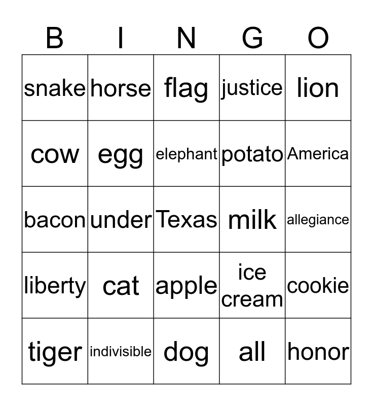 This bingo card has 25 words: cat, dog, elephant, tiger, lion, snake, cow, horse, milk, apple, potato, bacon, ice cream, cookie, egg, honor, allegiance, flag, America, under, Texas, indivisible, liberty, justice and all.