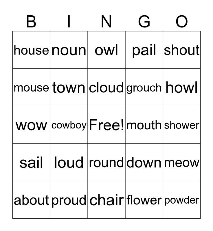 This bingo card has a free space and 24 words: loud, proud, cloud, about, shout, house, mouse, noun, mouth, round, grouch, wow, down, meow, town, flower, shower, owl, howl, cowboy, powder, sail, pail and chair.