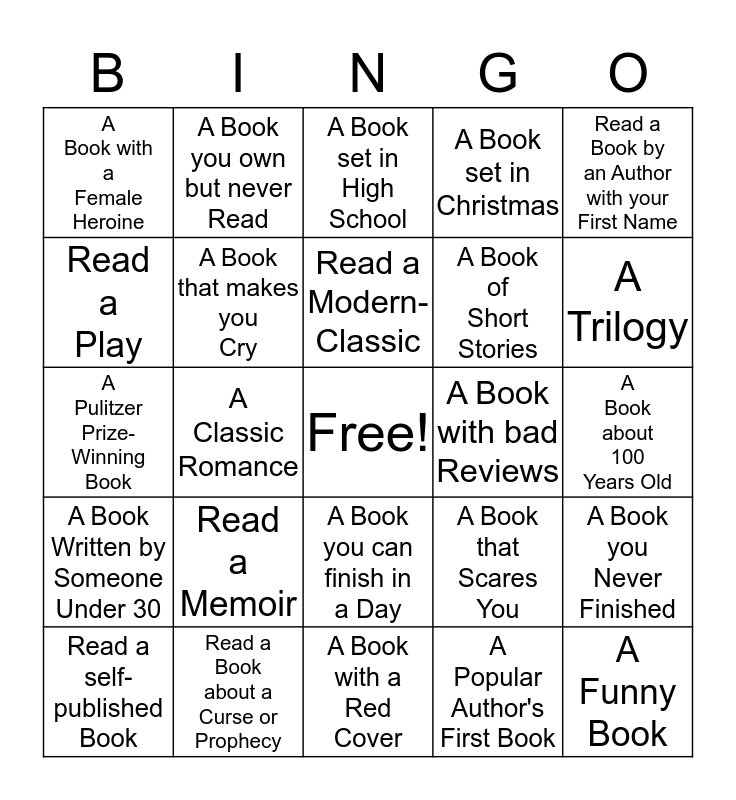 This bingo card has a free space and 24 words: Read a Memoir, Read a Book about a Curse or Prophecy, Read a Modern- Classic, Read a self- published Book, Read a Book by an Author with your First Name, A Book with a Female Heroine, Read a Play, A Book you own but never Read, A Book with bad Reviews, A Book you can finish in a Day, A Book of Short Stories, A Pulitzer Prize- Winning Book, A Book that Scares You, A Book you Never Finished, A Book that makes you Cry, A Popular Author's First Book, A Book about 100 Years Old, A Book set in High School, A Trilogy, A Classic Romance, A Funny Book, A Book Written by Someone Under 30, A Book set in Christmas and A Book with a Red Cover.