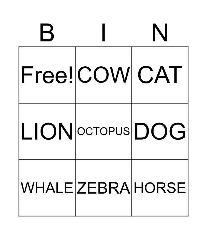 This bingo card has a free space and 8 words: DOG, CAT, COW, WHALE, Free!, HORSE, LION and ZEBRA.