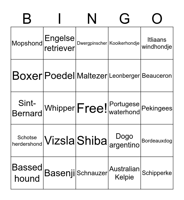 This bingo card has a free space and 24 words: Vizsla, Basenji, Maltezer, Bassed hound, Itliaans windhondje, Mopshond, Boxer, Engelse retriever, Portugese waterhond, Shiba, Leonberger, Sint-Bernard, Dogo argentino, Bordeauxdog, Poedel, Australian Kelpie, Pekingees, Dwergpinscher, Beauceron, Whipper, Schipperke, Schotse herdershond, Kooikerhondje and Schnauzer.