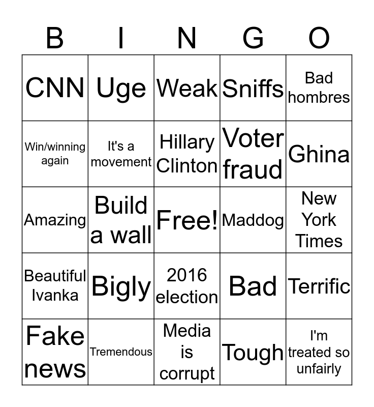 This bingo card has a free space and 24 words: Bigly, Tremendous, Hillary Clinton, Fake news, Bad hombres, CNN, Win/winning again, Uge, Maddog, 2016 election, Voter fraud, Amazing, Bad, Terrific, It's a movement, Tough, New York Times, Weak, Ghina, Build a wall, I'm treated so unfairly, Beautiful Ivanka, Sniffs and Media is corrupt.