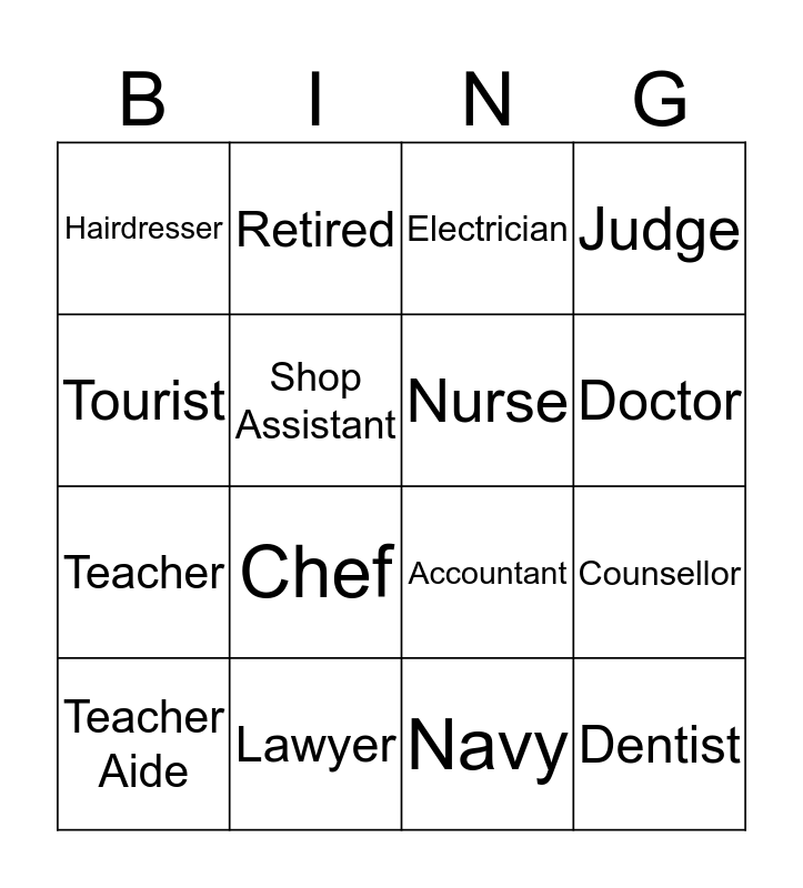 This bingo card has 28 words: Secretary, Journalist, Teacher, Police Officer, Shop Assistant, Electrician, Retired, Dentist, Lawyer, Student, Accountant, Judge, Vet, MakeUp Artist, Chef, Beautician, Babysitter, Nurse, Doctor, Builder, Hairdresser, Bank Clerk, Teacher Aide, Counsellor, Navy, Army, Tourist and Professional.