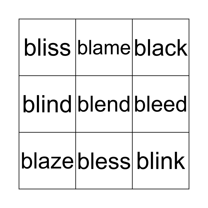 This bingo card has 9 words: blaze, black, blame, blind, bliss, bleed, blend, blink and bless.