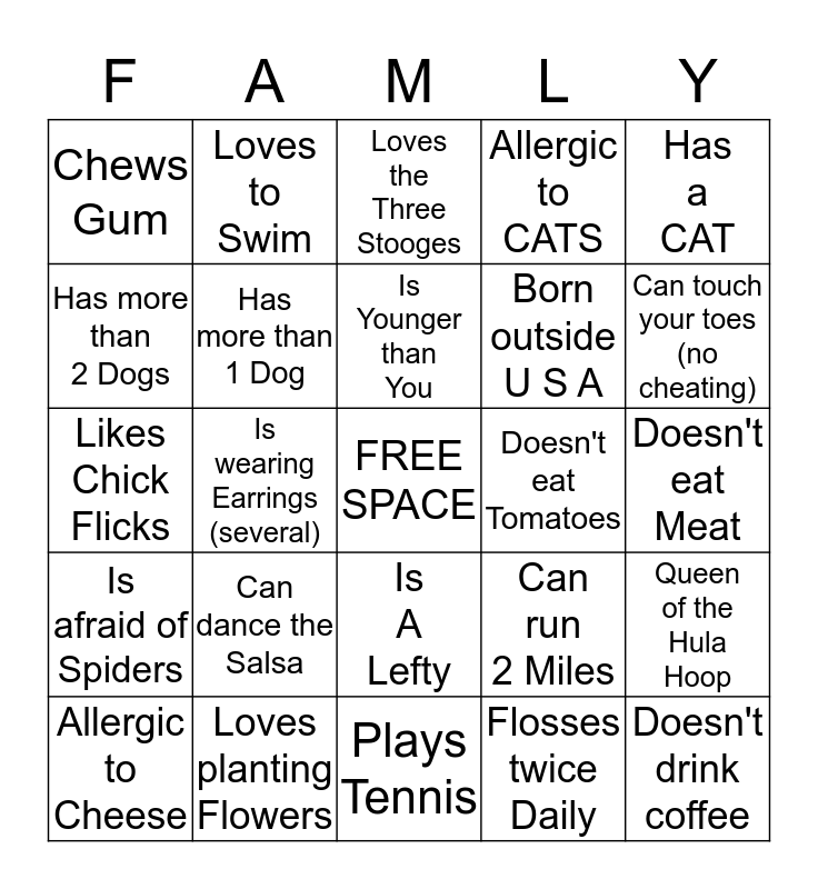 This bingo card has a free space and 24 words: Can dance the Salsa, Loves planting Flowers, Is Younger than You, Allergic to Cheese, Has a CAT, Chews Gum, Has more than 2 Dogs, Loves to Swim, Doesn't eat Tomatoes, Is A Lefty, Born outside U S A, Likes Chick Flicks, Can run 2 Miles, Queen of the Hula Hoop, Has more than 1 Dog, Flosses twice Daily, Doesn't eat Meat, Loves the Three Stooges, Can touch your toes (no cheating), Is wearing Earrings (several), Doesn't drink coffee, Is afraid of Spiders, Allergic to CATS and Plays Tennis.