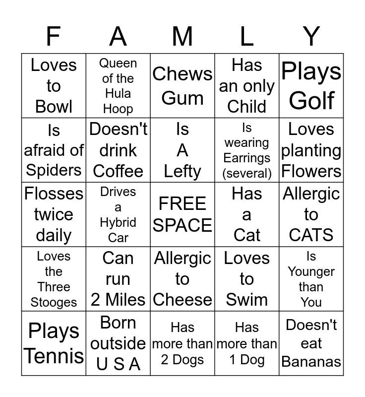 This bingo card has a free space and 24 words: Can run 2 Miles, Born outside U S A, Is A Lefty, Plays Tennis, Plays Golf, Loves to Bowl, Is afraid of Spiders, Queen of the Hula Hoop, Has a Cat, Allergic to Cheese, Is wearing Earrings (several), Flosses twice daily, Loves to Swim, Is Younger than You, Doesn't drink Coffee, Has more than 1 Dog, Allergic to CATS, Chews Gum, Loves planting Flowers, Drives a Hybrid Car, Doesn't eat Bananas, Loves the Three Stooges, Has an only Child and Has more than 2 Dogs.
