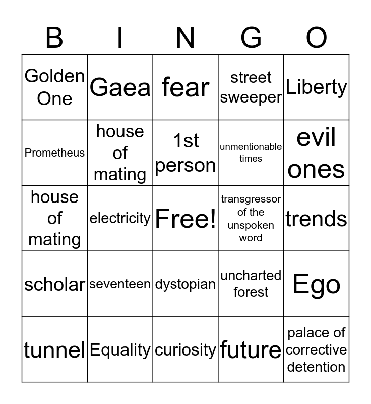 This bingo card has a free space and 26 words: dystopian, future, 1st person, Equality, Liberty, Golden One, Prometheus, Gaea, trends, uncharted forest, unmentionable times, house of mating, Ego, tunnel, electricity, plural prounouns, street sweeper, scholar, fear, palace of corrective detention, evil ones, curiosity, transgressor of the unspoken word, seventeen, house of mating and gardener.