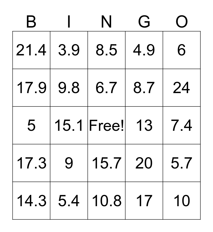 This bingo card has a free space and 24 words: 9, 5.4, 6.7, 14.3, 6, 21.4, 17.9, 3.9, 13, 15.7, 8.7, 5, 20, 5.7, 9.8, 17, 7.4, 8.5, 24, 15.1, 10, 17.3, 4.9 and 10.8.