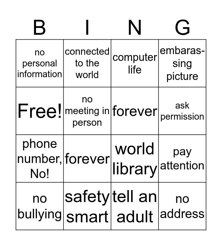 This bingo card has 16 words: safety smart, pay attention, computer life, no personal information, phone number, No!, connected to the world, world library, tell an adult, Free!, no meeting in person, no bullying, embaras-sing picture, forever, ask permission, forever and no address.