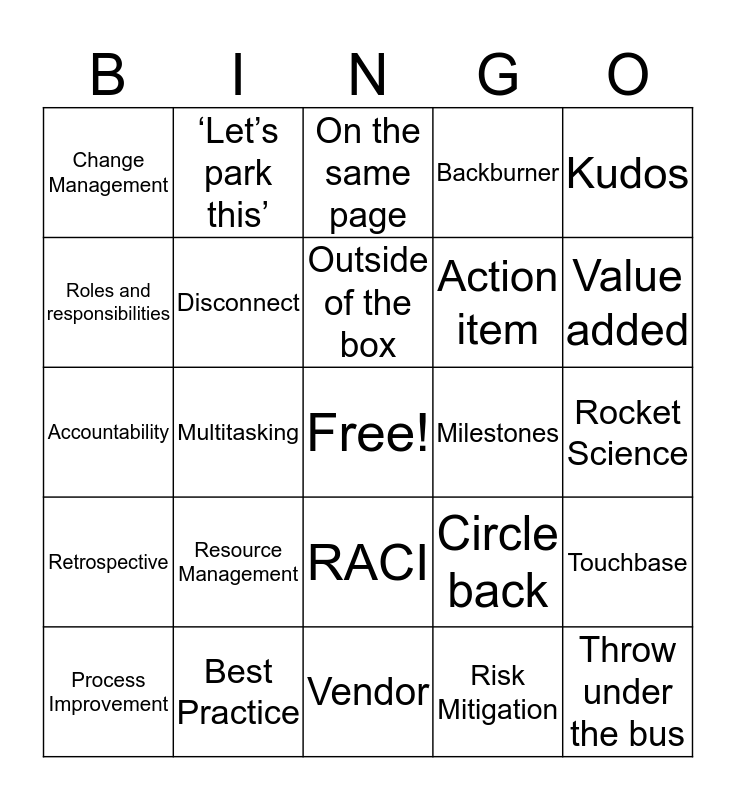 This bingo card has a free space and 56 words: Into the weeds, Process Improvement, Profitability, Change Management, Vendor, Buy-In, Disconnect, Top of the hour, Action item, Piggyback, Backburner, Face to Face, At the end of the day, 1:1, TC, Deep dive, Kudos, Multitasking, Heads Up, Throw under the bus, Milestones, On my plate, Circle back, On the same page, Take home message, Outside of the box, Chime in, Scope Creep, Value added, Challenging, Responsible, Going forward, RFP, Budget management, Rocket Science, Roles and responsibilities, Accountability, Micromanaging, Retrospective, ‘Let’s park this’, RACI, prospective, Red Flag, Vision, Mission Statement, Resource Management, Best Practice, Ramp Up, Approval, Transition, Risk Mitigation, Issue Log, Lessons Learned, Timeframe, Touchbase and Win-win.