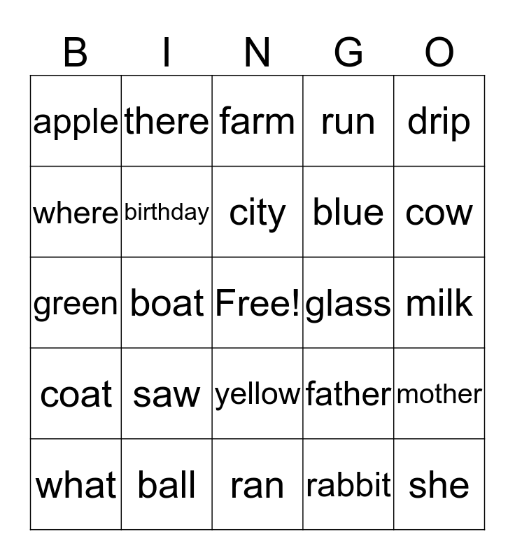 This bingo card has a free space and 24 words: saw, ball, city, what, drip, apple, where, there, glass, yellow, blue, green, father, mother, birthday, rabbit, milk, farm, cow, boat, she, coat, run and ran.