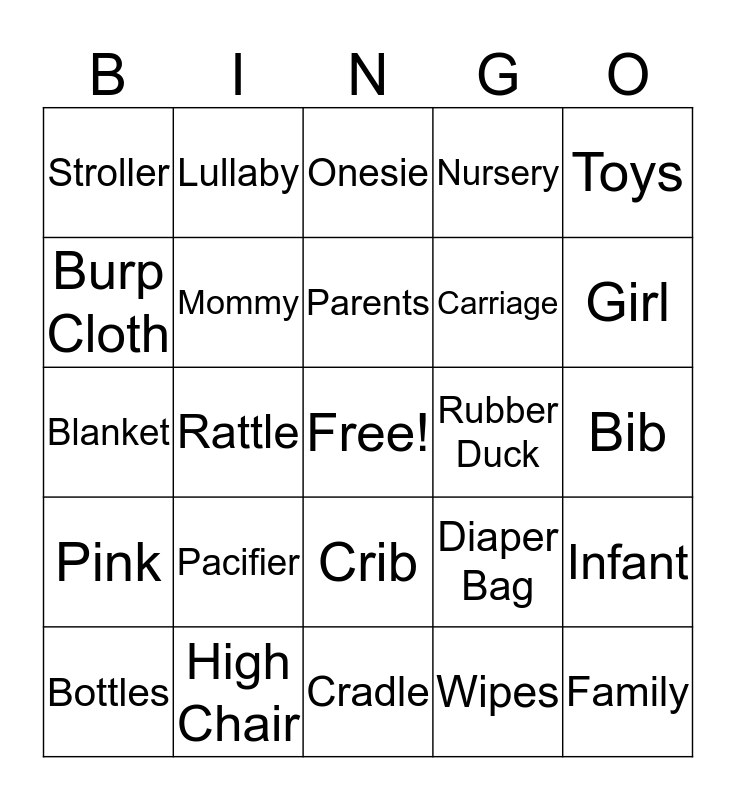 This bingo card has a free space and 29 words: Bottles, Diapers, Rattle, Formula, Stroller, Onesie, Mommy, Pacifier, Rubber Duck, High Chair, Bib, Family, Cradle, Wipes, Girl, Milk, Crib, Pink, Toys, Blanket, Diaper Bag, Baby, Carriage, Burp Cloth, Nursery, Lullaby, Infant, Parents and Car Seat.