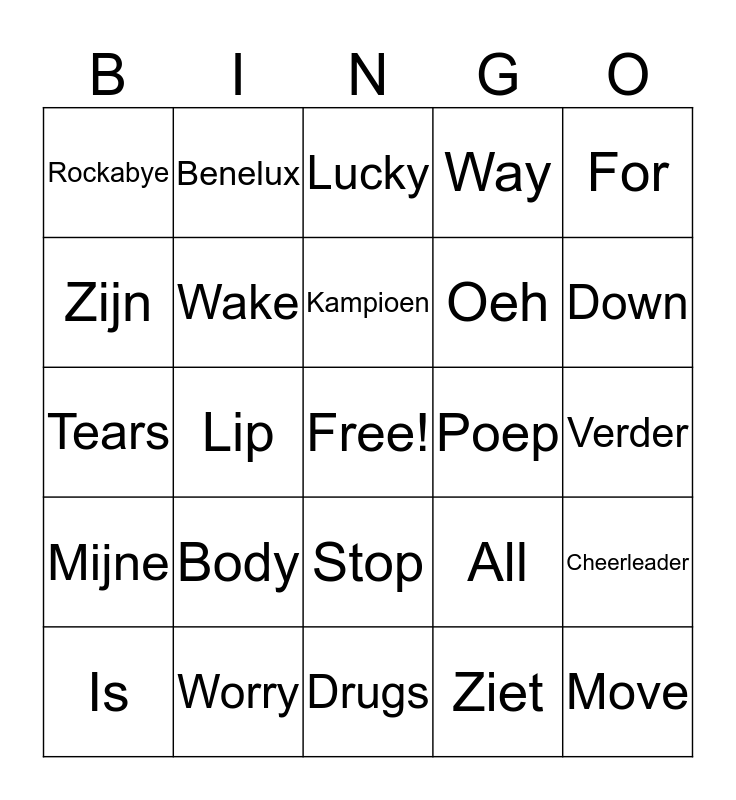 This bingo card has a free space and 24 words: Body, Worry, Kampioen, Is, For, Rockabye, Zijn, Benelux, Poep, Stop, Oeh, Tears, All, Cheerleader, Wake, Ziet, Verder, Lucky, Down, Lip, Move, Mijne, Way and Drugs.