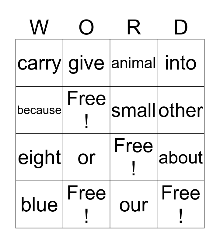 This bingo card has 16 words: Free !, about, animal, carry, eight, give, Free !, our, because, Free !, blue, into, or, other, small and Free !.