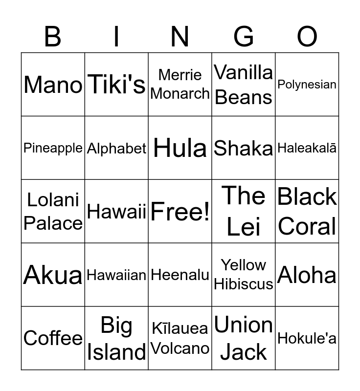 This bingo card has a free space and 28 words: Aloha, SPAM, Shaka, Union Jack, Pineapple, Merrie Monarch, Tiki's, Akua, The Lei, Coffee, Lolani Palace, Vanilla Beans, Big Island, Kīlauea Volcano, Haleakalā, Luau, Hawaiian, Alphabet, Hula, Heenalu, Mano, Kapa, Hokule'a, Hawaii, Black Coral, Yellow Hibiscus, Polynesian and Nene.