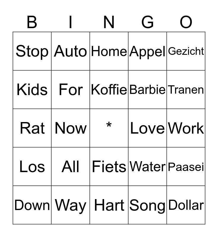 This bingo card has a free space and 29 words: Down, Kampioen, Now, Poep, Stop, Home, For, All, Love, Way, Work, Dollar, Hart, Song, Tranen, Marokkaan, Fiets, Los, Gezicht, Rat, Water, Laten, Barbie, Kids, Appel, Auto, Paasei, Koffie and Lamp.