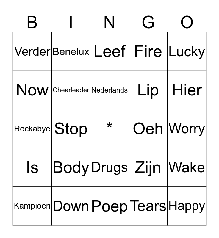 This bingo card has a free space and 24 words: Body, Down, Nederlands, Kampioen, Lucky, Verder, Now, Benelux, Oeh, Drugs, Lip, Rockabye, Zijn, Wake, Chearleader, Tears, Worry, Leef, Hier, Stop, Happy, Is, Fire and Poep.