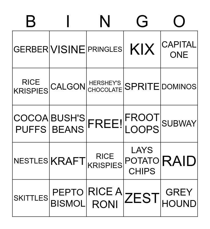 This bingo card has a free space and 59 words: PAPA JOHNS, PEPTO BISMOL, ALKA SELTZER, NESTLES, ZEST, LUCKY CHARMS, CALGON, CHIFFON MARGARIN, SPRITE, TRIX, KIX, VISINE, RICE KRISPIES, NYQUIL, PARKAY, GERBER, GREY HOUND, CAPITAL ONE, CHEVY TRUCKS, HERSHEY'S CHOCOLATE, FROOT LOOPS, PRINGLES, SKITTLES, RAID, JIFF, NAIR, SOMINEX, DIGIORNO, DOMINOS, LIL CAESARS, I HOP, OLIVE GARDEN, SPRITE, TARGET, VISINE, JIMMIE DEAN, MT DEW, BUSH'S BEANS, CHEVROLET, COCOA PUFFS, CRACKER JACKS, KRAFT, SUBWAY, PEPSI COLA, HERBAL ESSENCE, IRISH SPRING SOAP, EGGO, PRINGLES, RICE KRISPIES, RICE A RONI, GRREN GIANT, LUCKY CHARMS, SECRET, TIMEX, BOUNTY, LAYS POTATO CHIPS, GREY HOUND, NOXEMA and CHARMIN.