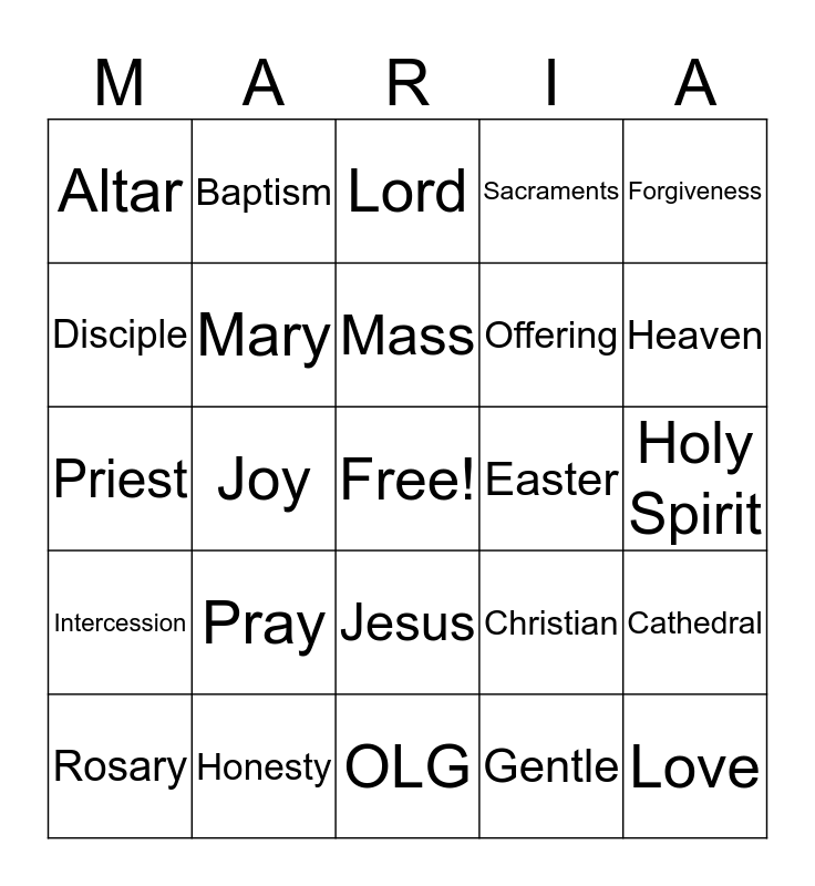 This bingo card has a free space and 24 words: Pray, Honesty, Mass, Rosary, Forgiveness, Altar, Disciple, Baptism, Easter, Jesus, Offering, Priest, Christian, Cathedral, Mary, Gentle, Holy Spirit, Lord, Heaven, Joy, Love, Intercession, Sacraments and OLG.