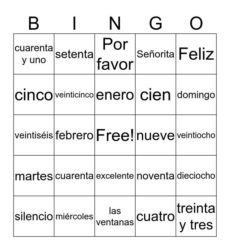 This bingo card has a free space and 113 words: Hola, Buenos días, Buenas tardes, Buenas noches, Señor., Señora, Señorita, Español, Ejercicio, mira, escucha, sí, no, ¿perdón?, solo un minuto, muy bien, excelente, bueno, bien hecho, tranquilo, silencio, Por favor, gracias, muchas gracias, lunes, martes, miércoles, jueves, viernes, sábado, domingo, enero, febrero, marzo, abril, mayo, junio, julio, agosto, septiembre, octubre, noviembre, diciembre, uno, dos, tres, cuatro, cinco, seis, siete, ocho, nueve, diez, once, doce, trece, catorce, quince, dieciséis, diecisiete, dieciocho, diecinueve, veinte, veintiuno, veintidós, veintitrés, veinticuatro, veinticinco, veintiséis, veintisiete, veintiocho, veintinueve, treinta, treinta y uno, treinta y dos, treinta y tres, cuarenta, cuarenta y uno, cuarenta y dos, cincuenta, sesenta, setenta, ochenta, noventa, cien, ¿Cómo?, ¿Que?, bien, muy bien, no muy bien, estupendo, fantastico, Feliz, mal, mas, menos, iqual, el libro, los libros, el lapiz, los lapices, la mesa, las mesas, la puerta, las puertas, la ventana, las ventanas, el mapa, los mapas, la silla, las sillas, de nada and Español.