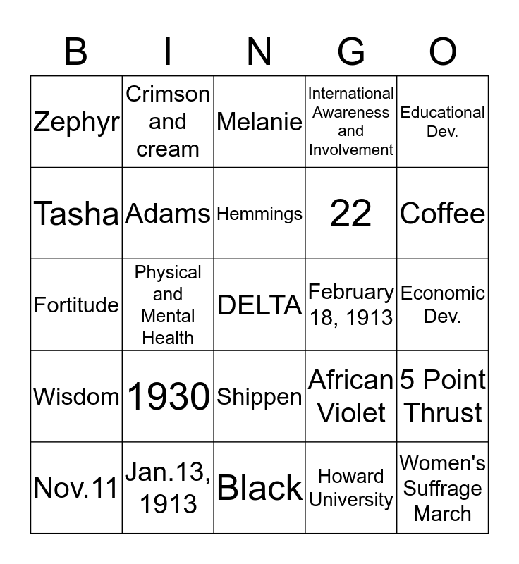 This bingo card has a free space and 24 words: 1930, Jan.13, 1913, Hemmings, Nov.11, Educational Dev., Zephyr, Tasha, Crimson and cream, February 18, 1913, Shippen, 22, Fortitude, African Violet, 5 Point Thrust, Adams, Howard University, Economic Dev., Melanie, Coffee, Physical and Mental Health, Women's Suffrage March, Wisdom, International Awareness and Involvement and Black.