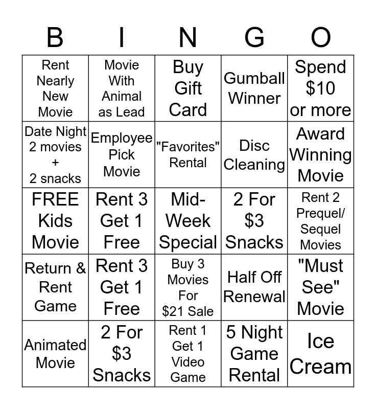 This bingo card has 25 words: Rent 3 Get 1 Free, Rent 1 Get 1 Video Game, "Favorites" Rental, Animated Movie, Spend $10 or more, Rent Nearly New Movie, Date Night 2 movies + 2 snacks, Movie With Animal as Lead, 2 For $3 Snacks, Buy 3 Movies For $21 Sale, Disc Cleaning, FREE Kids Movie, Half Off Renewal, "Must See" Movie, Employee Pick Movie, Ice Cream, Rent 2 Prequel/ Sequel Movies, Buy Gift Card, Award Winning Movie, Rent 3 Get 1 Free, Mid- Week Special, 2 For $3 Snacks, Return & Rent Game, Gumball Winner and 5 Night Game Rental.