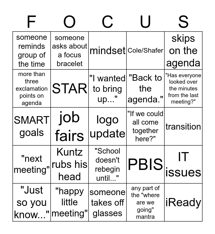 This bingo card has 25 words: Kuntz rubs his head, someone takes off glasses, "I wanted to bring up...", "Just so you know...", skips on the agenda, someone reminds group of the time, more than three exclamation points on agenda, someone asks about a focus bracelet, "If we could all come together here?", "School doesn't rebegin until...", "Back to the agenda.", SMART goals, PBIS, IT issues, STAR, iReady, transition, mindset, "Has everyone looked over the minutes from the last meeting?", job fairs, logo update, "happy little meeting", "next meeting", Cole/Shafer and any part of the "where are we going" mantra.