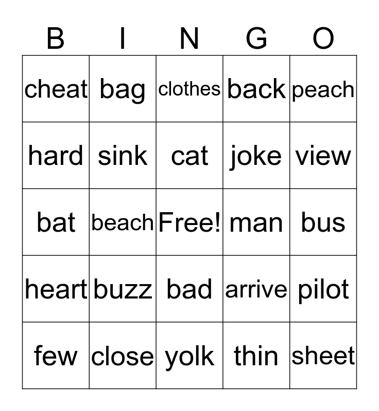 This bingo card has a free space and 24 words: buzz, close, cat, few, peach, cheat, hard, bag, man, bad, joke, bat, arrive, pilot, sink, thin, bus, clothes, view, beach, sheet, heart, back and yolk.