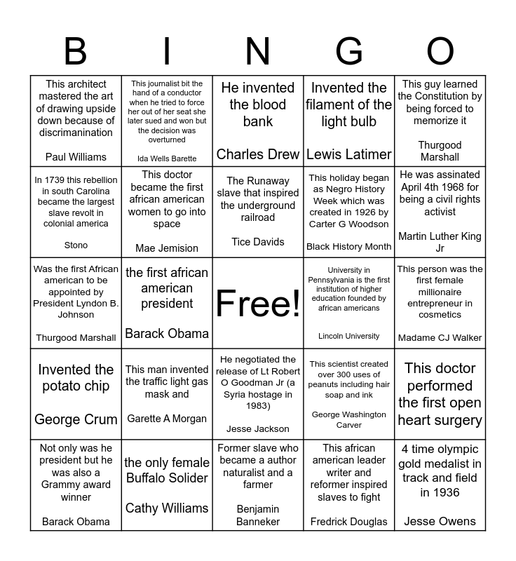 This bingo card has a free space and 24 words: This man invented the traffic light gas mask and Garette A Morgan, the only female Buffalo Solider Cathy Williams, The Runaway slave that inspired the underground railroad Tice Davids, Not only was he president but he was also a Grammy award winner Barack Obama, This guy learned the Constitution by being forced to memorize it Thurgood Marshall, This architect mastered the art of drawing upside down because of discrimanination Paul Williams, In 1739 this rebellion in south Carolina became the largest slave revolt in colonial america Stono, This journalist bit the hand of a conductor when he tried to force her out of her seat she later sued and won but the decision was overturned Ida Wells Barette, University in Pennsylvania is the first institution of higher education founded by african americans Lincoln University, He negotiated the release of Lt Robert O Goodman Jr (a Syria hostage in 1983) Jesse Jackson, This holiday began as Negro History Week which was created in 1926 by Carter G Woodson Black History Month, Was the first African american to be appointed by President Lyndon B. Johnson Thurgood Marshall, This scientist created over 300 uses of peanuts including hair soap and ink George Washington Carver, This doctor performed the first open heart surgery, This doctor became the first african american women to go into space Mae Jemision, This african american leader writer and reformer inspired slaves to fight Fredrick Douglas, This person was the first female millionaire entrepreneur in cosmetics Madame CJ Walker, He invented the blood bank Charles Drew, He was assinated April 4th 1968 for being a civil rights activist Martin Luther King Jr, the first african american president Barack Obama, 4 time olympic gold medalist in track and field in 1936 Jesse Owens, Invented the potato chip George Crum, Invented the filament of the light bulb Lewis Latimer and Former slave who became a author naturalist and a farmer Benjamin Banneker.