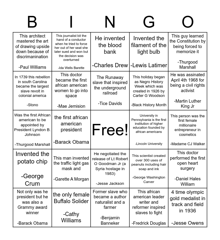This bingo card has a free space and 24 words: This man invented the traffic light gas mask and -Garette A Morgan, the only female Buffalo Solider -Cathy Williams, The Runaway slave that inspired the underground railroad -Tice Davids, Not only was he president but he was also a Grammy award winner -Barack Obama, This guy learned the Constitution by being forced to memorize it -Thurgood Marshall, This architect mastered the art of drawing upside down because of discrimanination -Paul Williams, In 1739 this rebellion in south Carolina became the largest slave revolt in colonial america -Stono, This journalist bit the hand of a conductor when he tried to force her out of her seat she later sued and won but the decision was overturned -Ida Wells Barette, University in Pennsylvania is the first institution of higher education founded by african americans -Lincoln University, He negotiated the release of Lt Robert O Goodman Jr (a Syria hostage in 1983) -Jesse Jackson, This holiday began as Negro History Week which was created in 1926 by Carter G Woodson -Black History Month, Was the first African american to be appointed by President Lyndon B. Johnson -Thurgood Marshall, This scientist created over 300 uses of peanuts including hair soap and ink -George Washington Carver, This doctor performed the first open heart surgery -Daniel Hales William, This doctor became the first african american women to go into space -Mae Jemision, This african american leader writer and reformer inspired slaves to fight -Fredrick Douglas, This person was the first female millionaire entrepreneur in cosmetics -Madame CJ Walker, He invented the blood bank -Charles Drew, He was assinated April 4th 1968 for being a civil rights activist -Martin Luther King Jr, the first african american president -Barack Obama, 4 time olympic gold medalist in track and field in 1936 -Jesse Owens, Invented the potato chip -George Crum, Invented the filament of the light bulb -Lewis Latimer and Former slave who became a author naturalist and a farmer -Benjamin Banneker.