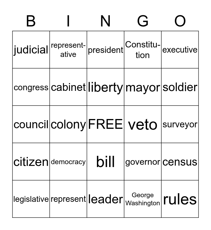 This bingo card has a free space and 24 words: democracy, represent, liberty, legislative, executive, judicial, congress, represent-ative, veto, bill, mayor, council, governor, census, cabinet, George Washington, surveyor, president, soldier, colony, rules, citizen, Constitu- tion and leader.