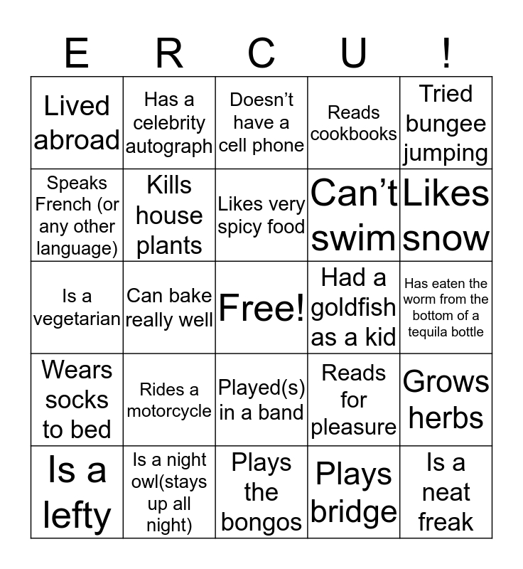 This bingo card has a free space and 25 words: Rides a motorcycle, Plays the bongos, Likes very spicy food, Is a lefty, Tried bungee jumping, Lived abroad, Speaks French (or any other language), Has a celebrity autograph, Had a goldfish as a kid, Played(s) in a band, Can’t swim, Is a vegetarian, Reads for pleasure, Grows herbs, Kills house plants, Is good at drawing, Has eaten the worm from the bottom of a tequila bottle, Doesn’t have a cell phone, Likes snow, Can bake really well, Is a neat freak, Is a night owl(stays up all night), Wears socks to bed, Reads cookbooks and Plays bridge.