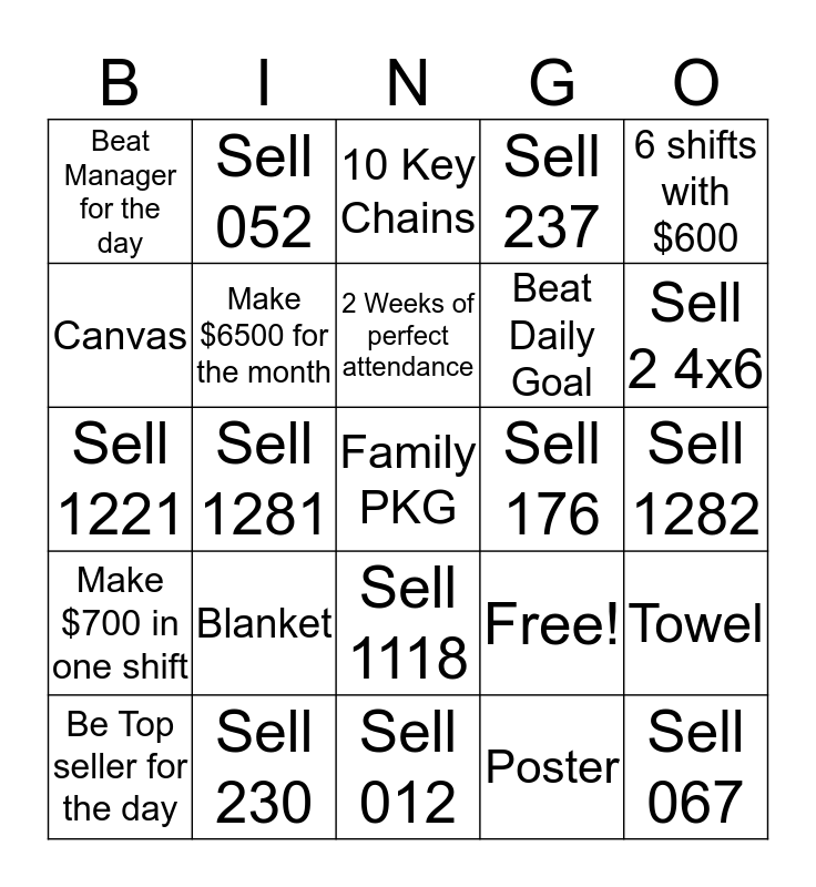 This bingo card has 25 words: Blanket, Sell 012, 2 Weeks of perfect attendance, Be Top seller for the day, 6 shifts with $600, Beat Manager for the day, Canvas, Sell 052, Sell 176, Sell 1118, Beat Daily Goal, Sell 1221, Free!, Towel, Make $6500 for the month, Sell 067, Sell 1282, 10 Key Chains, Sell 2 4x6, Sell 1281, Family PKG, Sell 230, Make $700 in one shift, Sell 237 and Poster.