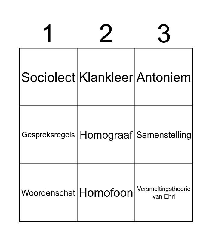 This bingo card has a free space and 8 words: Samenstelling, Antoniem, Klankleer, Woordenschat, Sociolect, Versmeltingstheorie van Ehri, Gespreksregels and Homofoon.
