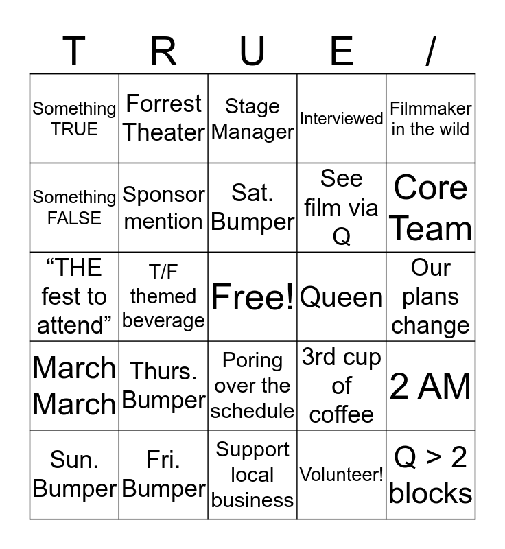 This bingo card has a free space and 24 words: Thurs. Bumper, Fri. Bumper, Sat. Bumper, Sun. Bumper, Filmmaker in the wild, Something TRUE, Something FALSE, Forrest Theater, Queen, Poring over the schedule, See film via Q, “THE fest to attend”, 3rd cup of coffee, 2 AM, Sponsor mention, Volunteer!, Our plans change, Stage Manager, Core Team, T/F themed beverage, Q > 2 blocks, March March, Interviewed and Support local business.