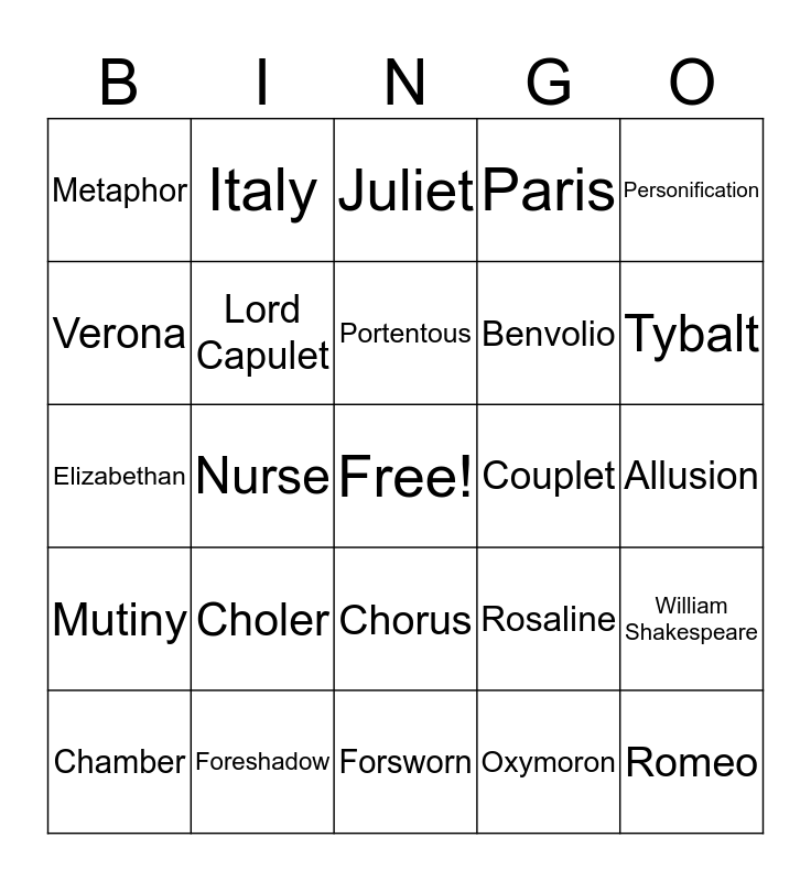 This bingo card has a free space and 24 words: Choler, Foreshadow, Portentous, Chamber, Personification, Metaphor, Verona, Italy, Couplet, Chorus, Benvolio, Elizabethan, Rosaline, William Shakespeare, Lord Capulet, Oxymoron, Allusion, Juliet, Tybalt, Nurse, Romeo, Mutiny, Paris and Forsworn.