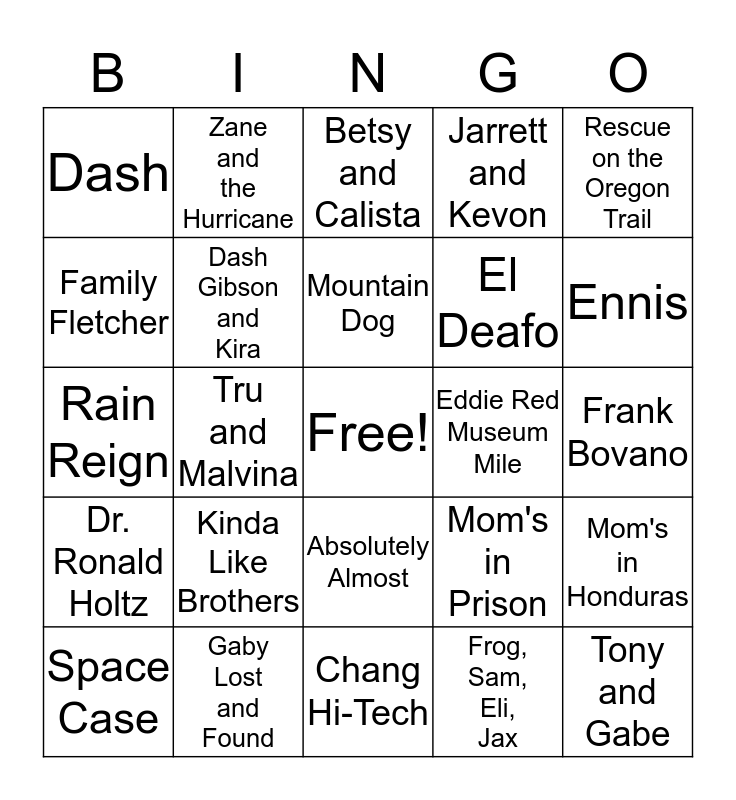 This bingo card has a free space and 24 words: Kinda Like Brothers, Gaby Lost and Found, Mountain Dog, Space Case, Rescue on the Oregon Trail, Dash, Family Fletcher, Zane and the Hurricane, Eddie Red Museum Mile, Absolutely Almost, El Deafo, Rain Reign, Mom's in Prison, Mom's in Honduras, Dash Gibson and Kira, Frog, Sam, Eli, Jax, Frank Bovano, Betsy and Calista, Ennis, Tru and Malvina, Tony and Gabe, Dr. Ronald Holtz, Jarrett and Kevon and Chang Hi-Tech.