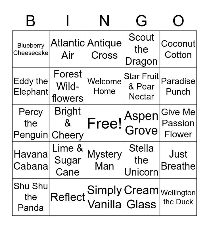 This bingo card has a free space and 24 words: Lime & Sugar Cane, Reflect, Welcome Home, Shu Shu the Panda, Coconut Cotton, Blueberry Cheesecake, Eddy the Elephant, Atlantic Air, Aspen Grove, Mystery Man, Star Fruit & Pear Nectar, Percy the Penguin, Stella the Unicorn, Just Breathe, Forest Wild- flowers, Cream Glass, Give Me Passion Flower, Antique Cross, Paradise Punch, Bright & Cheery, Wellington the Duck, Havana Cabana, Scout the Dragon and Simply Vanilla.