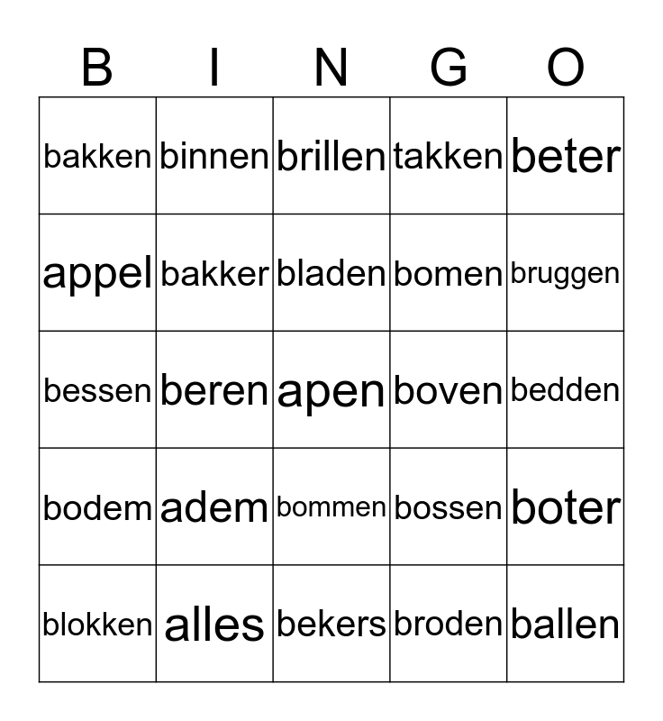 This bingo card has a free space and 24 words: adem, alles, bladen, blokken, beter, bakken, appel, binnen, boven, bommen, bomen, bessen, bossen, boter, bakker, broden, bedden, brillen, bruggen, beren, ballen, bodem, takken and bekers.