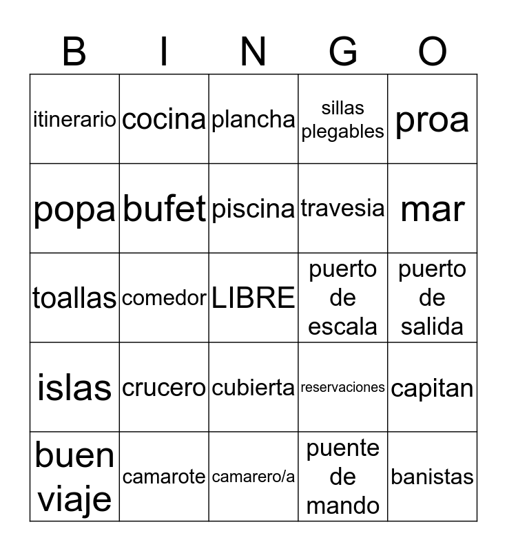This bingo card has a free space and 24 words: crucero, camarote, piscina, buen viaje, proa, itinerario, popa, cocina, puerto de escala, cubierta, travesia, toallas, reservaciones, capitan, bufet, puente de mando, puerto de salida, plancha, mar, comedor, banistas, islas, sillas plegables and camarero/a.