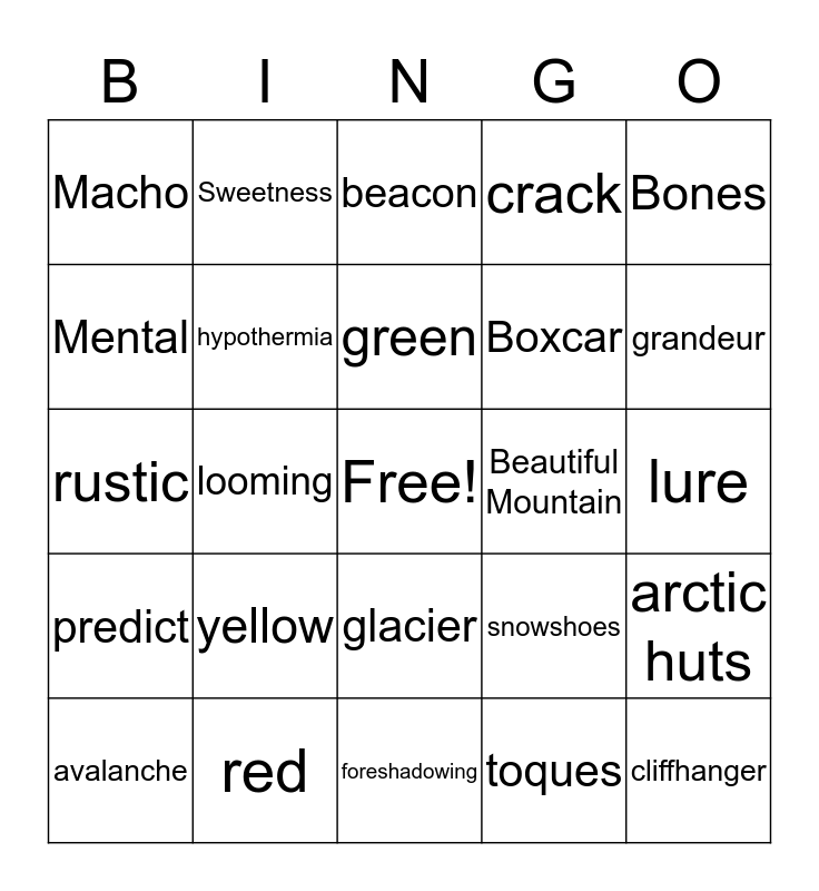 This bingo card has a free space and 24 words: yellow, red, green, avalanche, Bones, Macho, Mental, Sweetness, Beautiful Mountain, glacier, Boxcar, rustic, snowshoes, arctic huts, hypothermia, toques, lure, beacon, grandeur, looming, cliffhanger, predict, crack and foreshadowing.