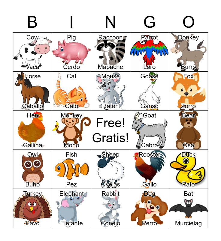 This bingo card has 24 images, a free space and 24 words: Fish Pez, Elephant Elefante, Mouse Raton, Turkey Pavo, Donkey Burro, Cow Vaca, Horse Caballo, Pig Cerdo, Goat Cabro, Sheep Ovejas, Goose Ganso, Hen Gallina, Rooster Gallo, Duck Pato, Cat Gato, Dog Perro, Bear Oso, Raccoon Mapache, Fox Zorro, Monkey Mono, Bat Murcielag, Owl Buho, Parrot Loro and Rabbit Conejo.