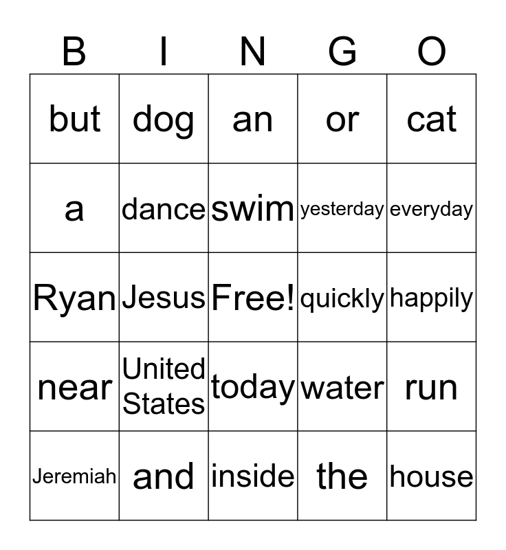 This bingo card has a free space and 24 words: United States, and, swim, Jeremiah, cat, but, a, dog, quickly, today, yesterday, Ryan, water, run, dance, the, happily, an, everyday, Jesus, house, near, or and inside.